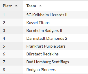 Unsere zweite Mannschaft nahm 2025 an der neu gegründeten Regionalliga Hessen teil. Mit sechs Siegen aus 14 Partien belegten unsere „Bad Badgers“ (Spitzname selbst gewählt“ einen überzeugenden dritten Platz vor dem Frankfurter Stadtrivalen.